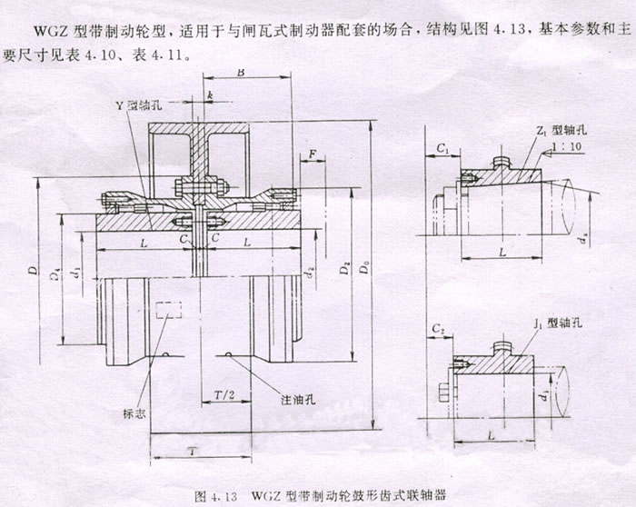 表4.10 WGZ型带制动轮鼓型齿式联轴器基本参数和主要尺寸(JB/T 7003-93)/mm